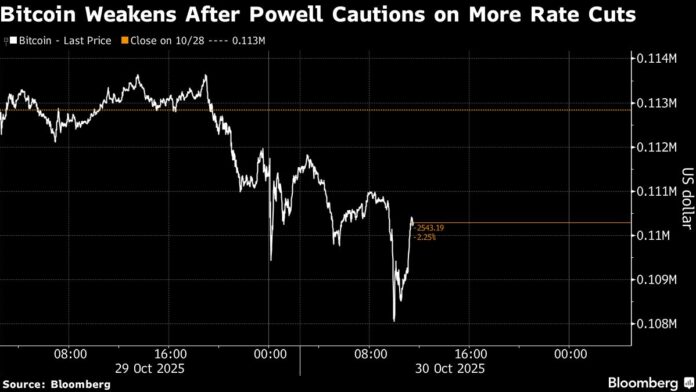 Bitcoin continued to lose ground after hawkish remarks from Federal Reserve Chair Jerome Powell dampened expectations for another interest-rate cut this year.