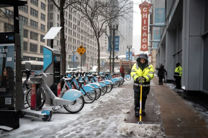 Heavy snow will drop on Chicago late Sunday into Monday’s commute, further snarling air travel already disrupted by the US government shutdown and ushering in a cold blast that will bring near-freezing temperatures to New York City and as deep as Florida and Texas.